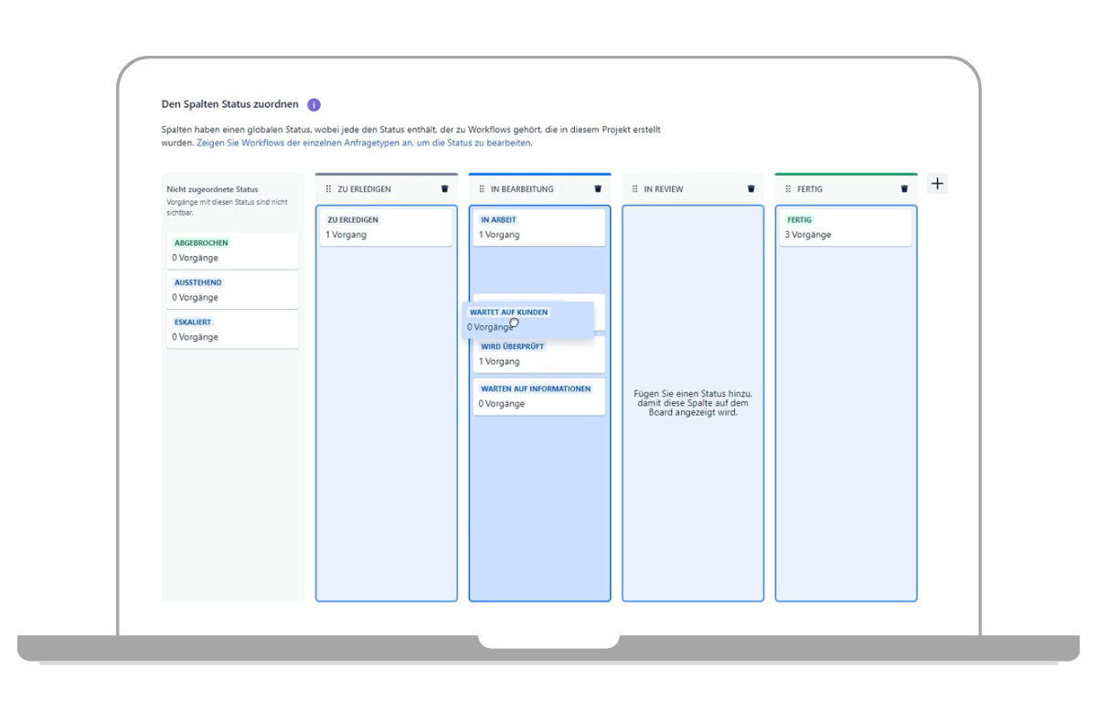 Bitte beachten Sie, dass es bei den neuen Board-Ansichten in Jira Service Management derzeit noch Einschränkungen gibt. Aktuell gilt noch ein Limit für Boards, das bis zu 5.000 offene und kürzlich geschlossene Tickets pro Projekt unterstützt. Bei größeren Projekten funktioniert die Board-Ansicht derzeit noch nicht.