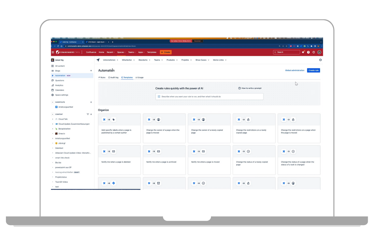 Das User-Interface von Confluence Automations präsentiert sich im neuen Gewand und wir haben einen direkten Zugriff auf der Startseite – auch in Jira Automations. Die eigentliche Neuheit liegt jedoch in der intelligenten Regelgenerierung.