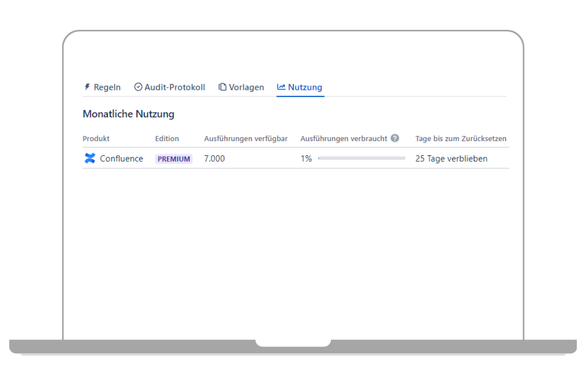 - Bei Cloud Premium gibt es ein Limit der Regelausführungen pro Monat: Pro monatlich bezahltem Benutzer stehen 1.000 Regelausführungen zur Verfügung. Beispiel: Wenn Sie 50 lizenzierte Benutzer für Ihr Confluence haben, können Sie pro Monat bis zu 50.000 Automatisierungen ausführen.