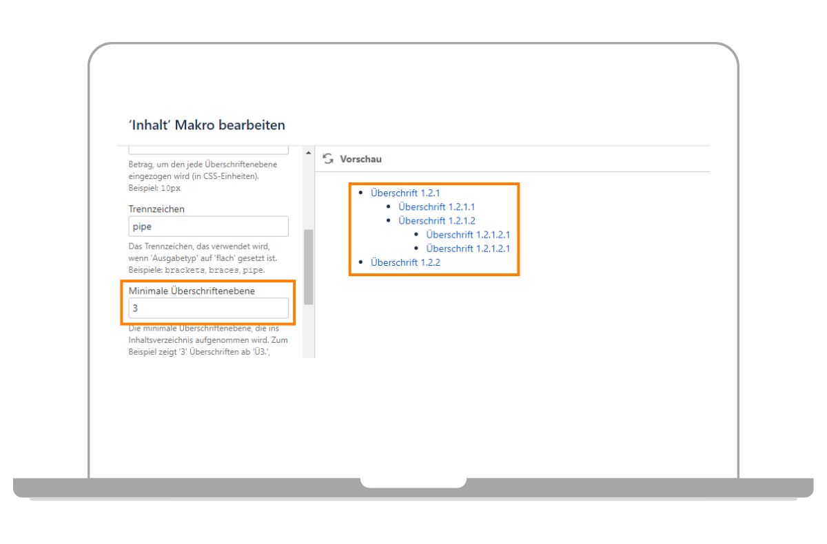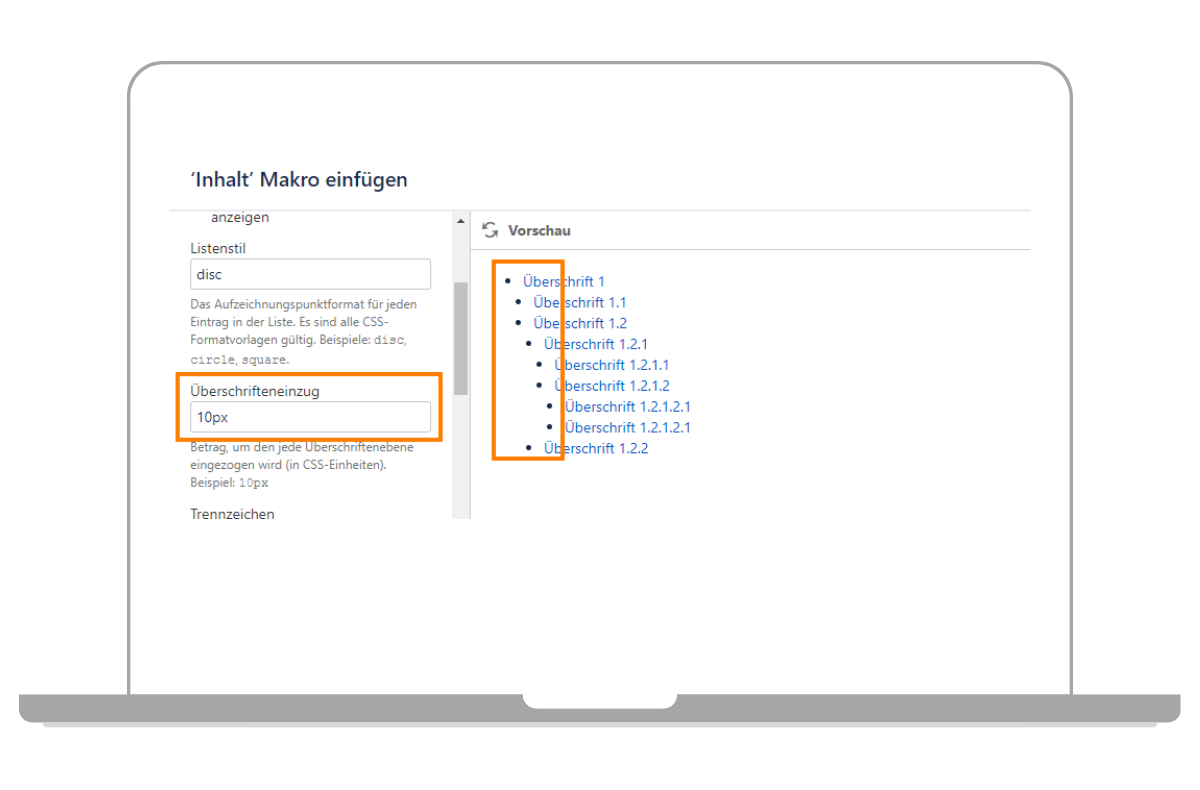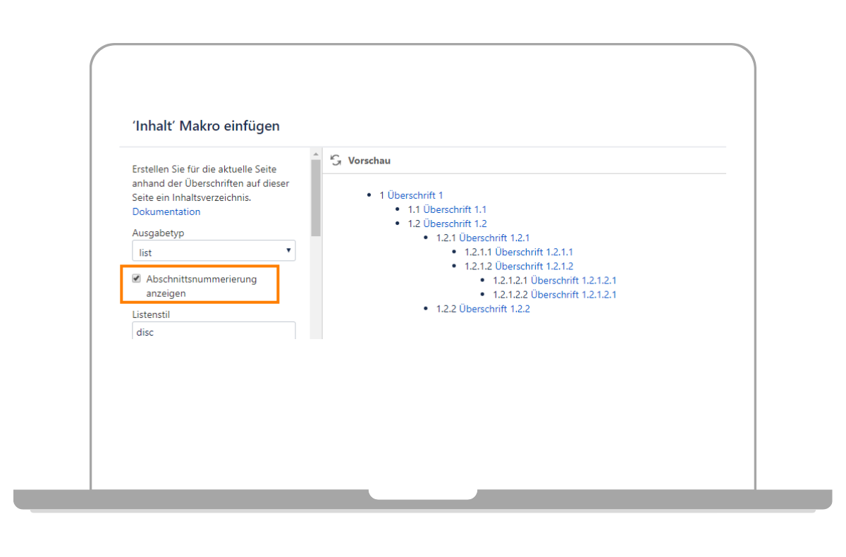 In dem Fenster zum Konfigurieren des Inhaltsverzeichnisses können Sie nun verschiedene Einstellungen vornehmen. Wichtig: indem Sie auf den Button „Vorschau“ klicken, können Sie direkt sehen wie sich die Einstellungen auf die Darstellung des Confluence Inhaltsverzeichnisses auswirken. Sollte die Einstellung direkt für Sie passen, dann klicken Sie einfach auf „Einfügen“ und Sie haben der Seite ein Inhaltsverzeichnis hinzugefügt. Weitere Einstellungsmöglichkeiten erläutern wir Ihnen in den nächsten Abschnitten.