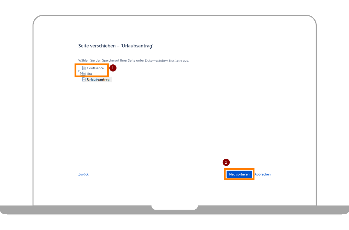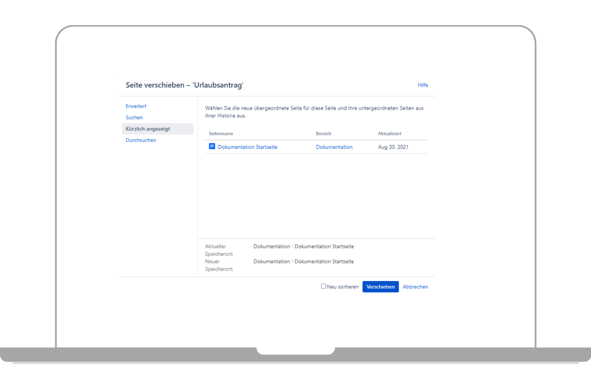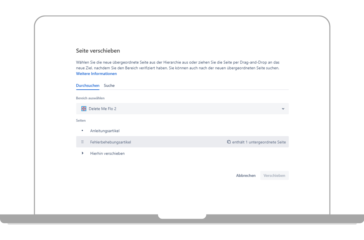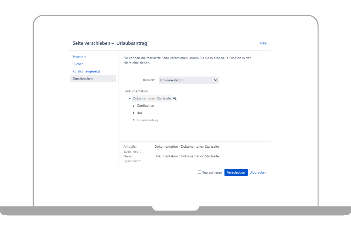 Hierfür bietet Confluence eine einfache Möglichkeit, Seiten zu verschieben und dann auch direkt neu einzusortieren. Die Confluence-Seiten können wahlweise innerhalb eines Bereichs oder zwischen verschiedenen Bereichen verschoben werden.