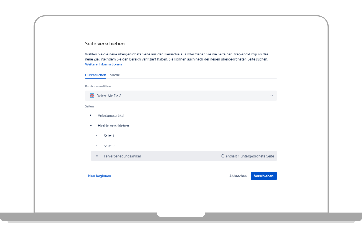 - Durchsuchen: Bei dieser Option sehen Sie alle Seiten eines ausgewählten Bereichs und deren Anordnung. Sie können dann einfach eine Seite markieren, die Ihre neue übergeordnete Seite sein soll oder per Drag&Drop die Seite, die Sie verschieben möchten, an die entsprechende Position setzen.