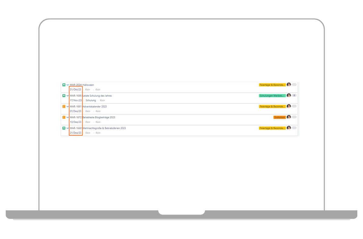 Mit der Aufteilung Ihrer Vorgänge in Tickettypen und Publish Dates haben Sie schon eine erste Grundlage für einen Redaktionsplan. Diesen können Sie nun mithilfe von Epics und Stichwörtern weiter klassifizieren.