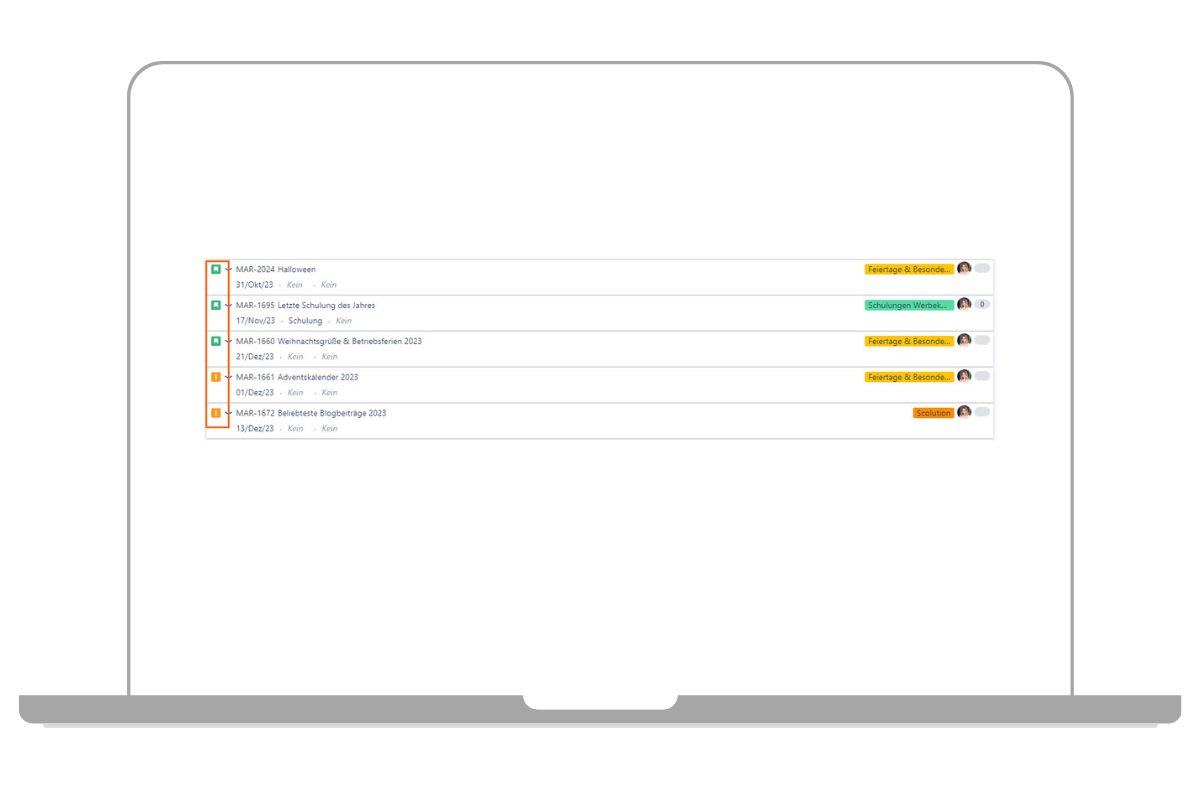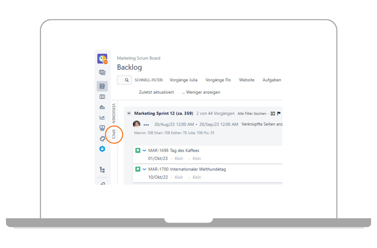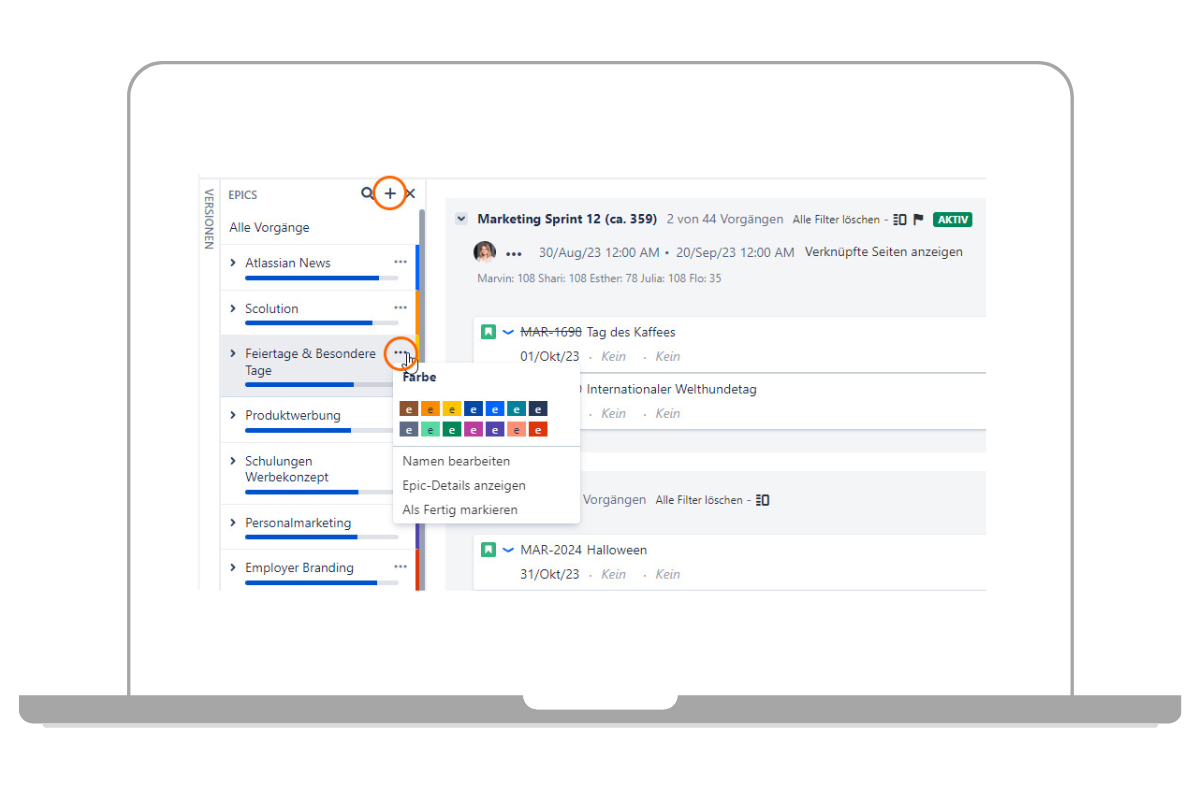 Epics können Sie nutzen, um verschiedene Vorgänge in Jira zu gruppieren. Mithilfe von Epics können Sie zum einen eine Zuordnung Ihrer Beiträge zu bestimmten Kampagnen oder Aktionen, wie „Messen 2023“ oder „Werbekonzept Redaktionsplan“ vornehmen. Andererseits können Sie hier auch eine thematische Zuordnung zu wiederkehrenden Themen Ihrer Beiträge vornehmen, wie beispielsweise „Unternehmenseinblicke“ oder „Produktneuheiten“. Mehr über Epics und wie Sie diese anlegen, erfahren Sie im Beitrag Jira Epic vs Story vs Task – was sind die Unterschiede?.