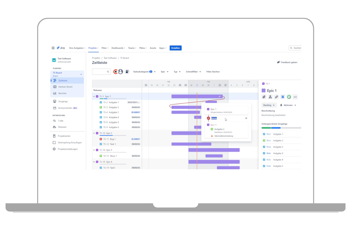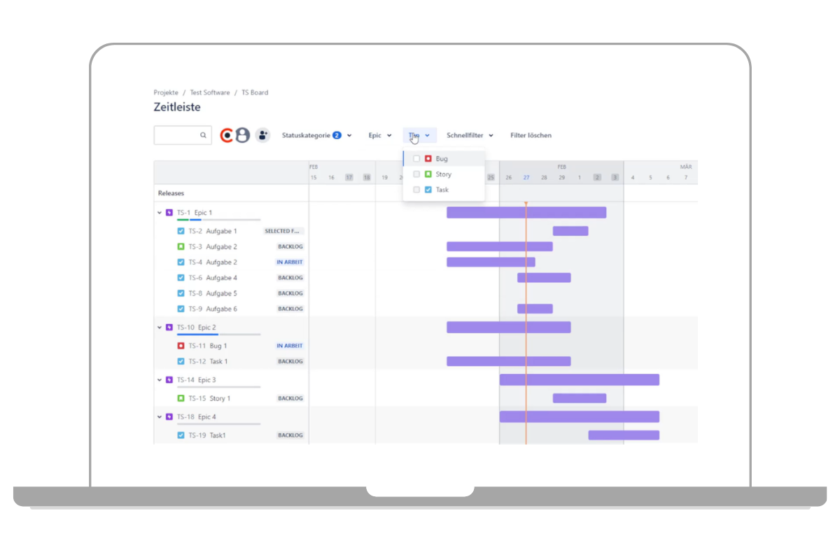 In der Übersicht wird zwischen Epics und den dazu untergeordneten Aufgaben unterschieden. Aufgaben können in der Zeitleiste nur ersichtlich sein, wenn sie mit einem Epic verknüpft sind. In Jira Software stehen Epics für große Aufgabeneinheiten, die in einzelne Tasks unterteilt werden können. Diese Aufgaben sind dann untergeordnete Vorgänge des Epics. Das Epic kann auch als übergeordneter Vorgang bezeichnet werden. Die Unterschiede von Epics und Tasks haben wir Ihnen bereits im Beitrag Jira Epic vs Story vs Task – was sind die Unterschiede? erklärt.