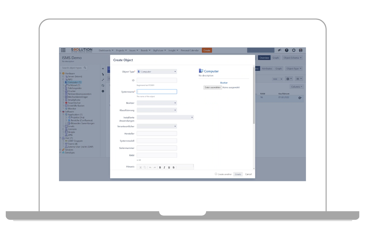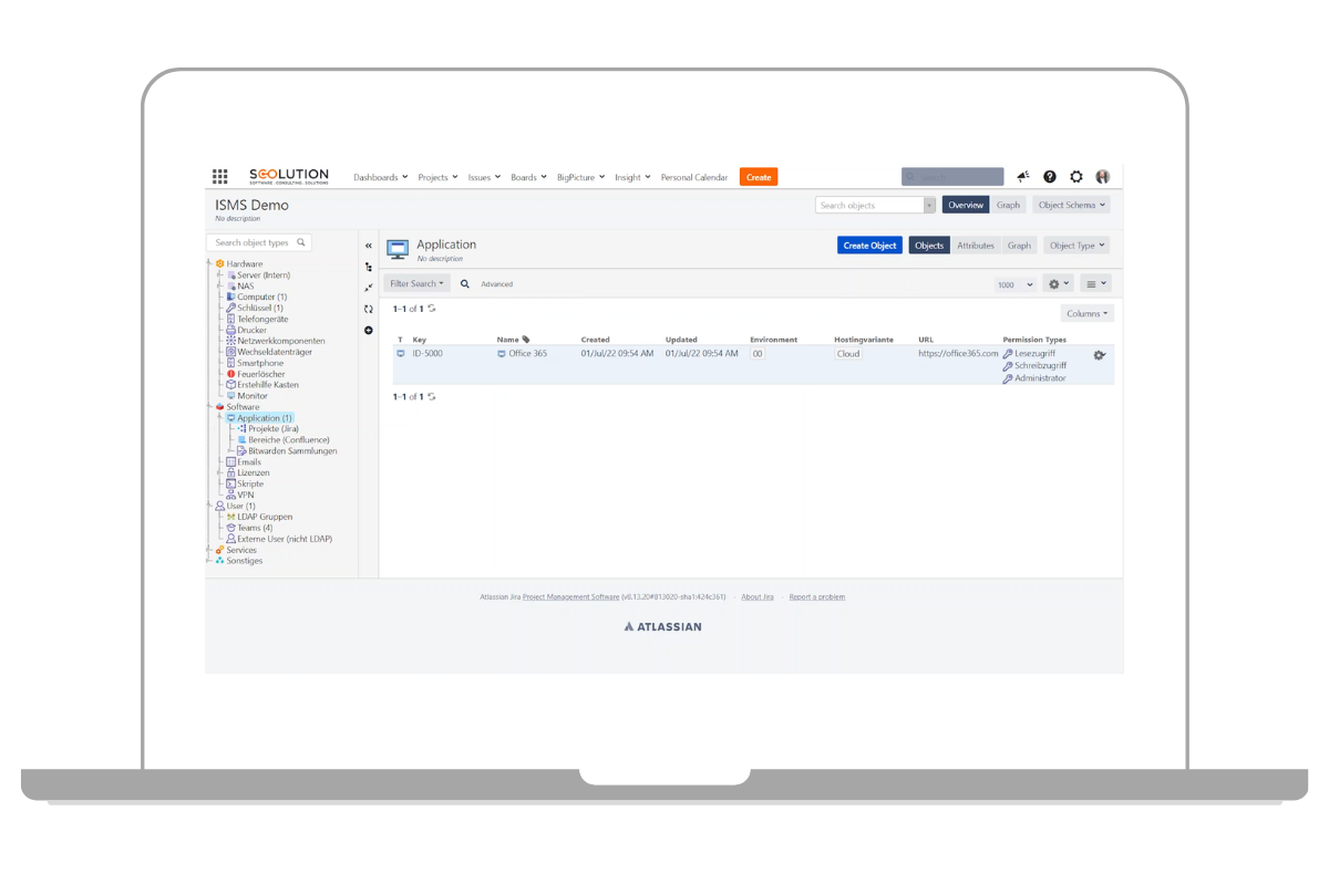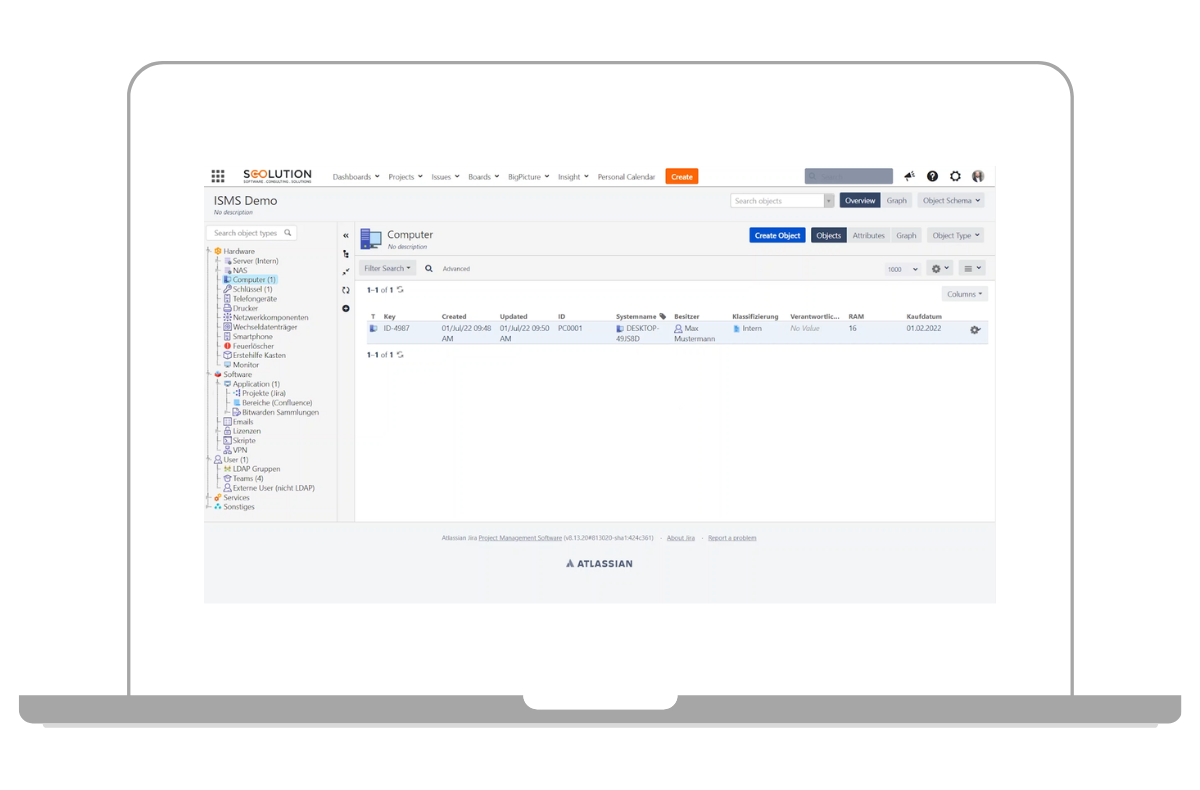 Die ISO-27001 gibt vor, dass alle relevanten Werte in einer Liste gepflegt bzw. inventarisiert sein müssen. Wie bereits erwähnt, nutzen wir hierfür Jira. Mit der Erweiterung Jira Insight haben wir die Möglichkeit, ein komplettes Asset Management oder auch CMDB (Configuration Management Database) in Jira abzubilden.