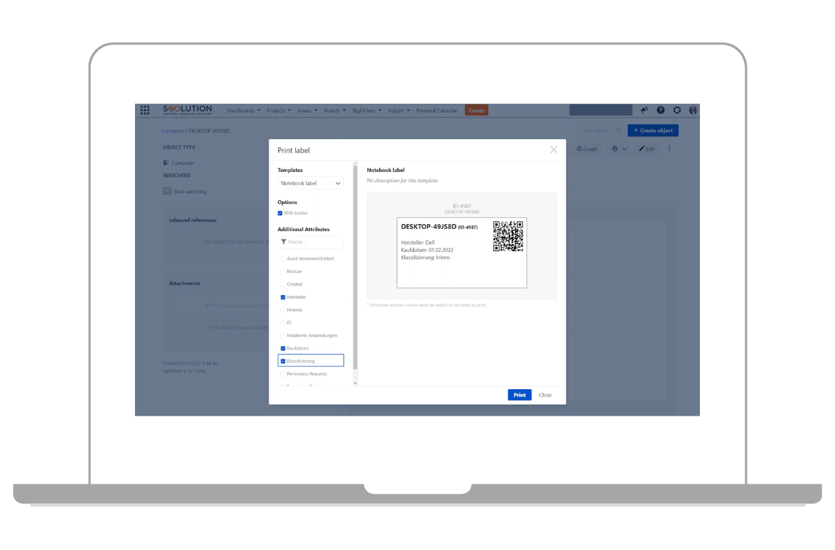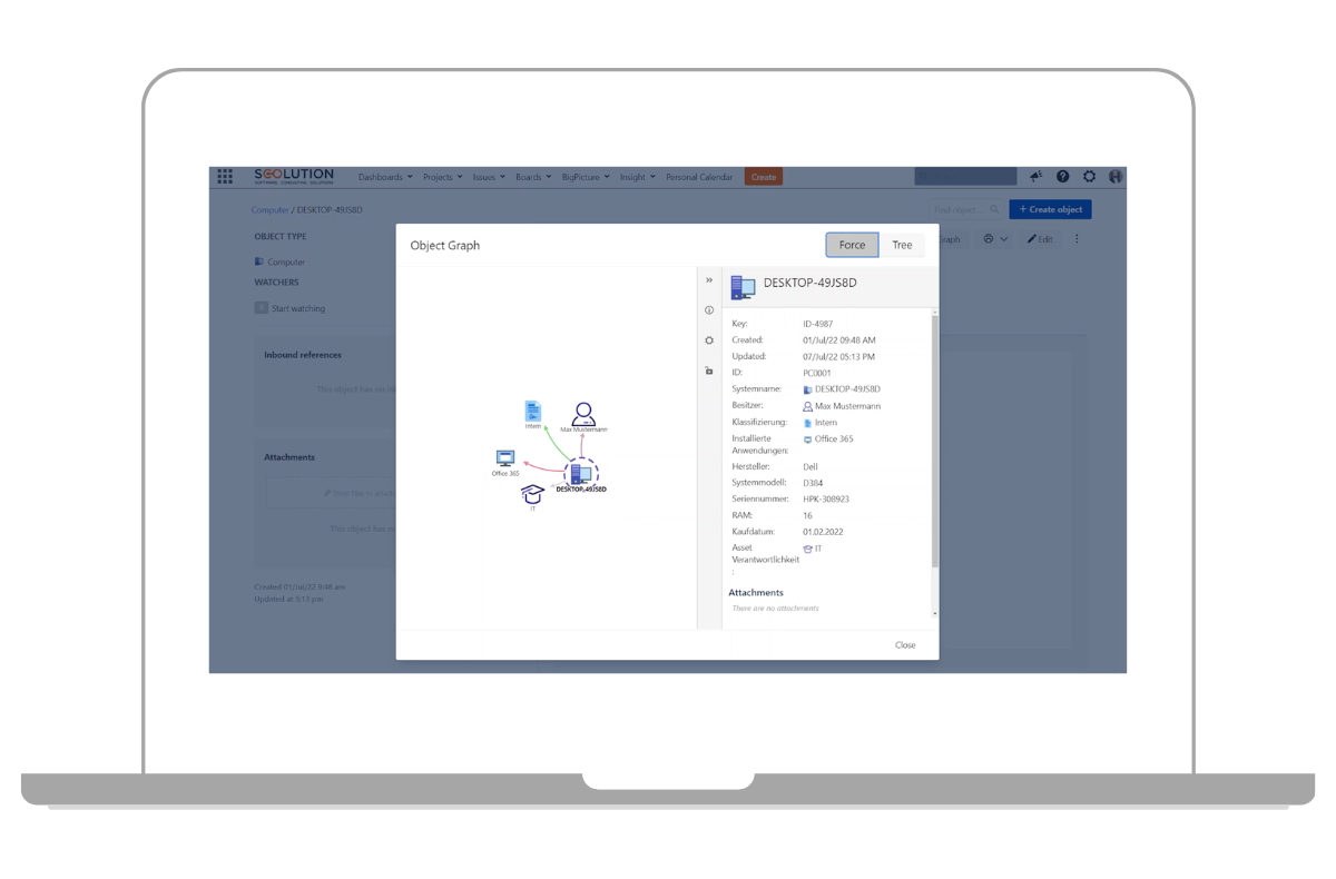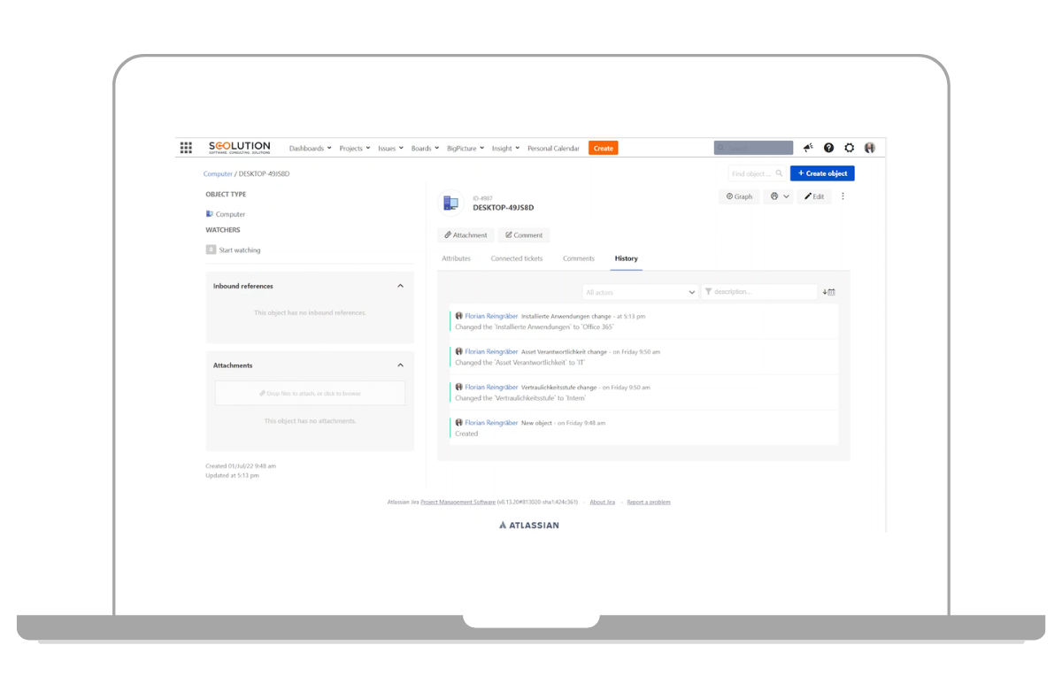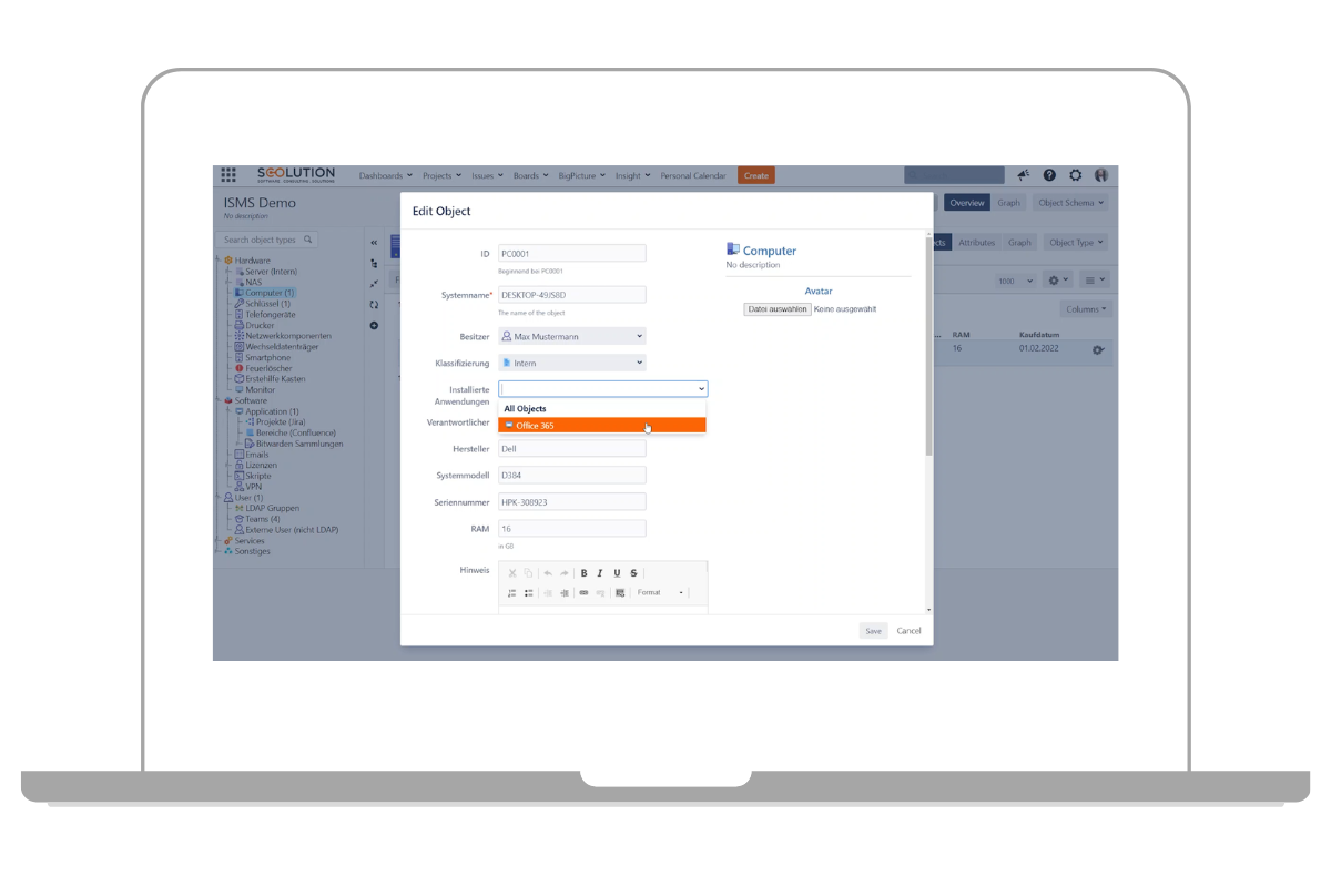 Die ISO-27001 gibt vor, dass alle relevanten Werte in einer Liste gepflegt bzw. inventarisiert sein müssen. Wie bereits erwähnt, nutzen wir hierfür Jira. Mit der Erweiterung Jira Insight haben wir die Möglichkeit, ein komplettes Asset Management oder auch CMDB (Configuration Management Database) in Jira abzubilden.