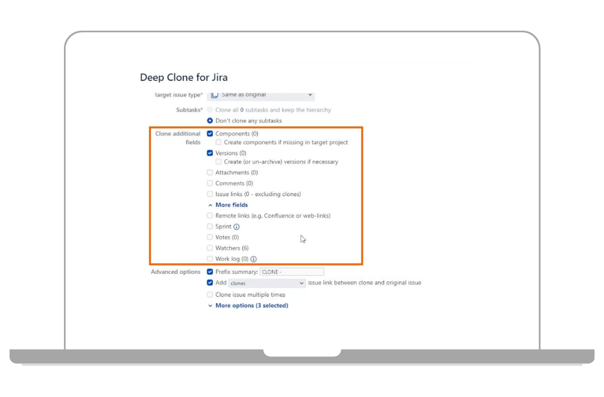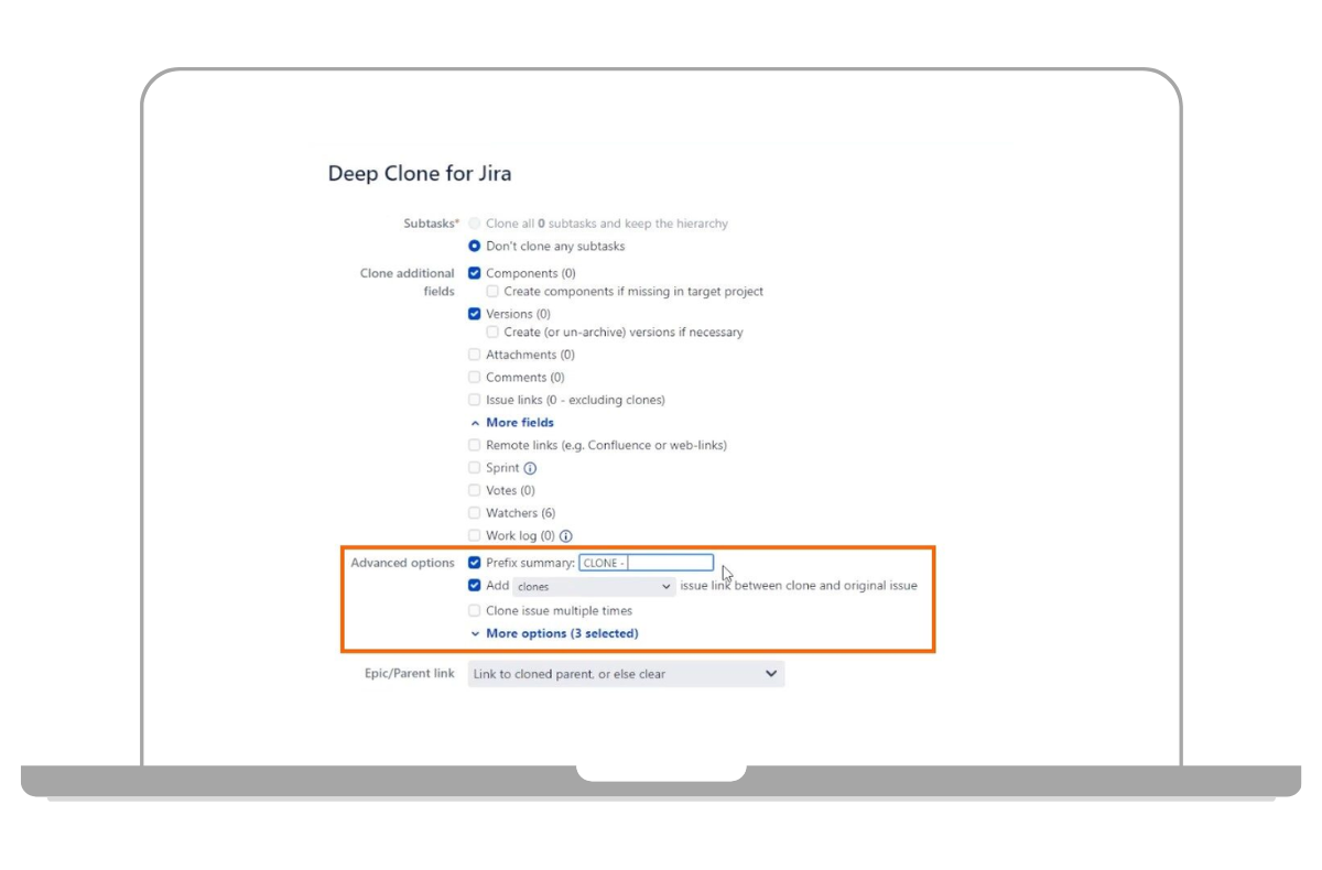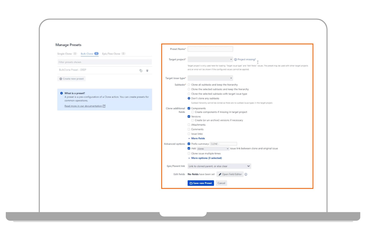 Mit dem Plugin können Klone bspw. direkt in ein anderes Projekt verschoben werden. Auch das Verändern und Bearbeiten der Vorgangstypen direkt beim Klonen ist möglich sowie das Klonen von einer Instanz zu einer anderen. Klonen Sie ganz einfach Projektvorlagen – einschließlich der Projektkonfiguration. Klonen Sie Vorgänge oder Sprints, duplizieren Sie wiederkehrende Epics und ihre untergeordneten Vorgänge und behalten dabei ihre Hierarchie bei. Sogar das Automatisieren des Klonens mit einer Workflow-Postfunction (Folgefunktion) ist möglich. Ein weiterer Vorteil des Plugins ist, dass größere Klon-Aufträge einfach im Hintergrund laufen können, während man weiterarbeitet. Sobald der Klon-Auftrag beendet ist, werden Sie per E-Mail benachrichtigt.