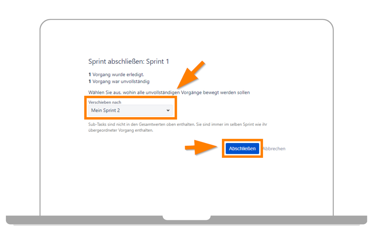 - Falls Sie Vorgänge mit Unteraufgaben im Sprint hatten und das Hauptticket abgeschlossen wurde, aber nicht alle Unteraufgaben, dann wird das Hauptticket mit allen Unteraufgaben auch in einen neuen Sprint oder den Backlog verschoben. Alle abgeschlossenen Aufgaben behalten dabei ihren Status beim Abschluss des Sprints.