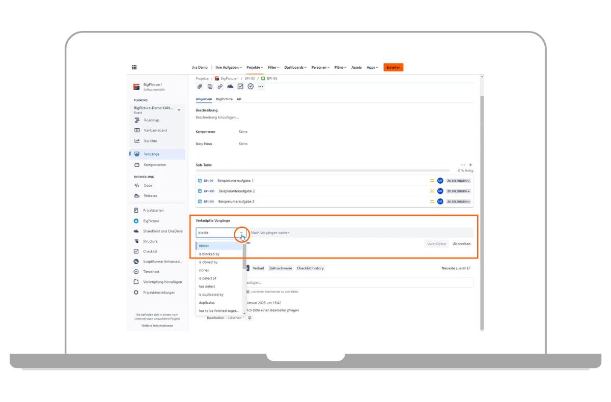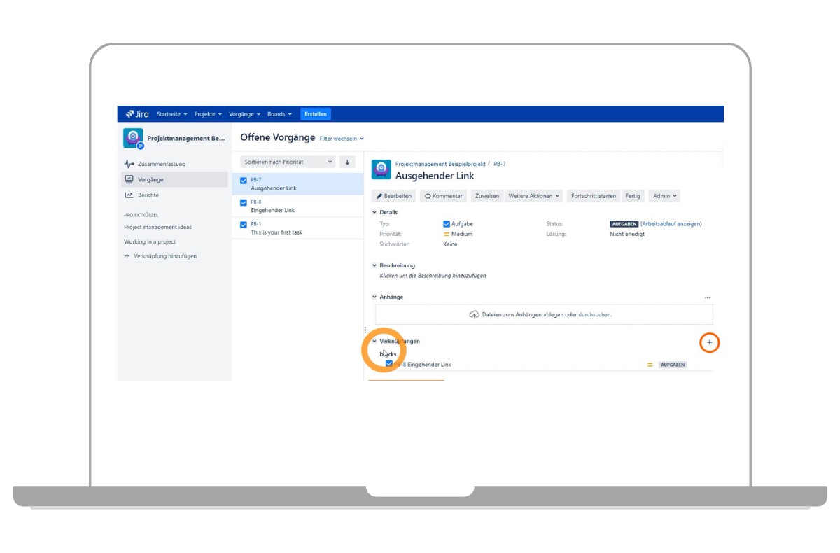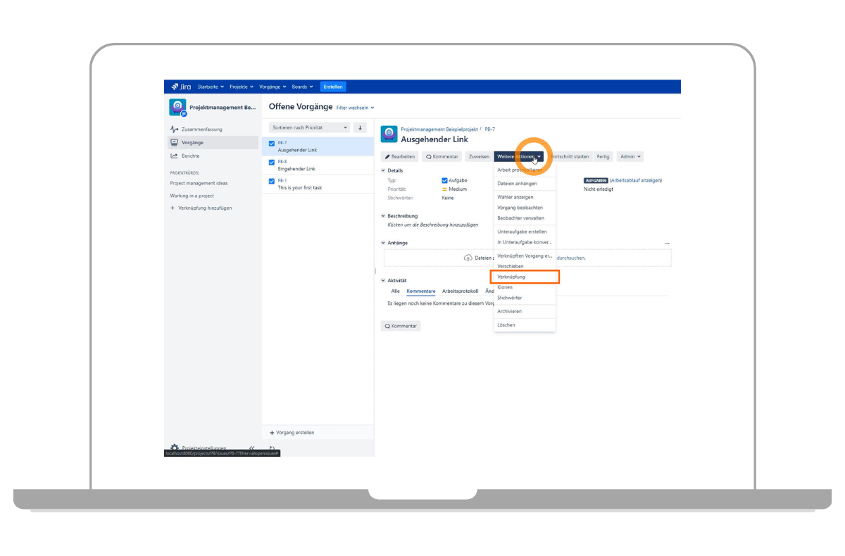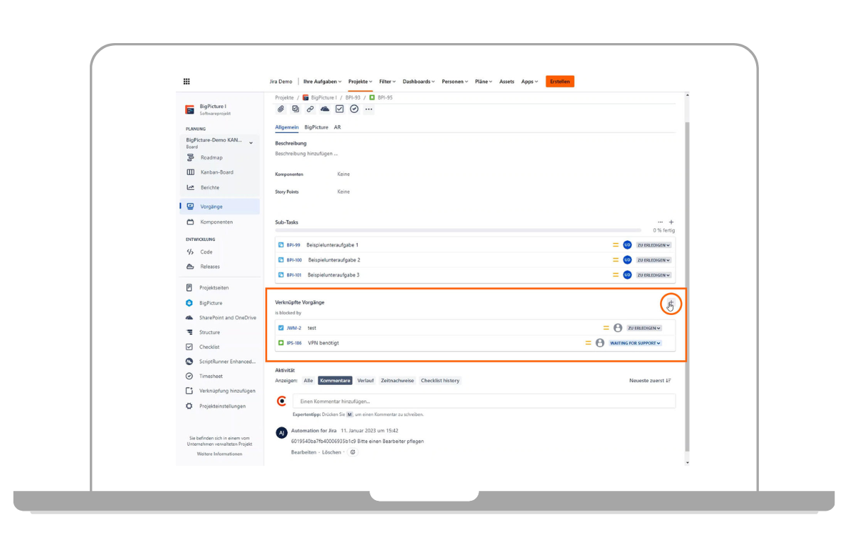 Um Abhängigkeiten zwischen einzelnen Jira-Tickets darzustellen, bietet Jira die Möglichkeit, einzelne Tickets miteinander zu verlinken. In den Jira-Tickets kann man dann sehen, mit welchen Tickets Verlinkungen bestehen und direkt zum verlinkten Ticket wechseln. Das hilft vor allem bei der Planung von Projekten und Aufgaben, die zum Beispiel nacheinander bearbeitet werden müssen oder voneinander abhängig sind.