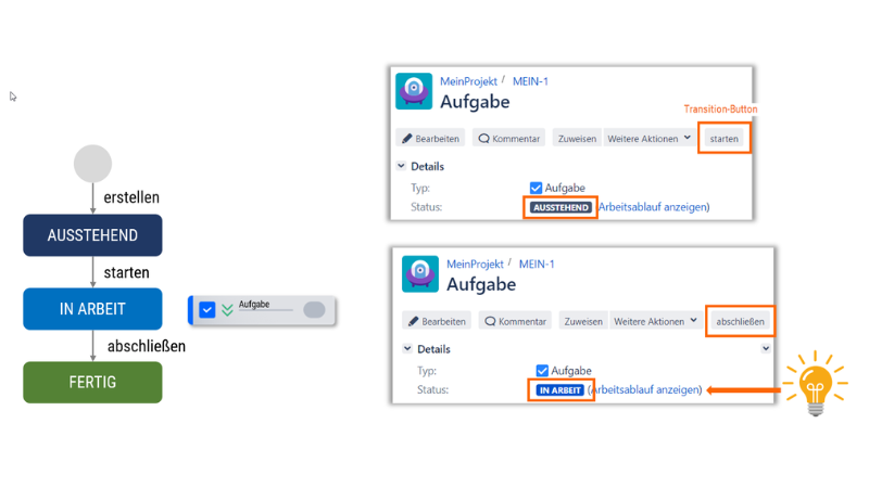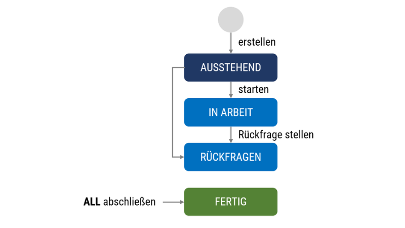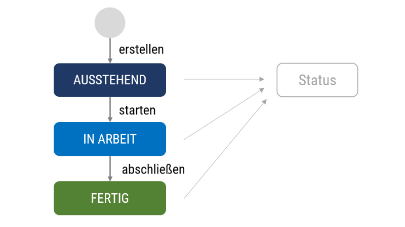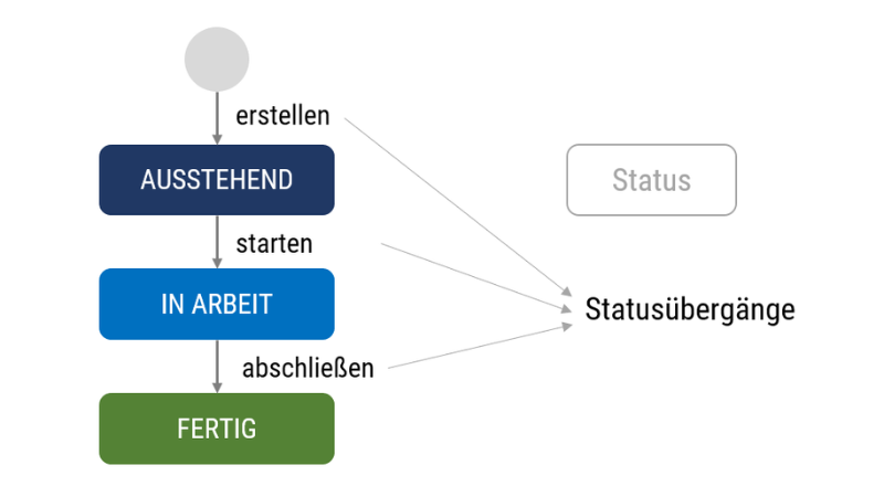 Workflows haben einen klar definierten Aufbau. Sie bestehen zum einen aus einem Status und zum anderen aus Statusübergängen. Der Status verdeutlichen in der Regel, wo sich das Issue momentan im Arbeitsablauf befindet. So kann schnell erfasst werden, ob eine Aufgabe gerade bearbeitet wird oder bereits erledigt ist.